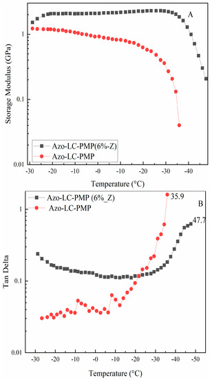 Dynamic mechanical analysis of Azo-LC-PMP amd Azo-LC-PMP(6%_Z). (A) Comparison of storage modulus of the two formulations (B) TanDelta comparison of the Azo-LC-PMP(6%_Z) and Azo-LC-PMP.