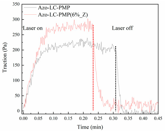 Another result that showed the superior properties of the composite PMP compared to the bare version was the measuring of the traction ability of the films reported in Figure 9. The PMPs were irradiated while clamped to a dynamometer. The Azo-LC-PMP(6%_Z), when irradiated with 2.5 W/cm2, was able to express a higher force when at plateau (275 Pa) compared to the bare film (200 Pa). Furthermore, when the PMPs were irradiated with a laser power as low as 1 W/cm2, only Azo-LC-PMP(6%_Z) was able to produce some force. It is important to note that such an experiment was performed irradiating PMPs on a small area (0.05 cm2) compared to the total area of the PMPs (x cm2).