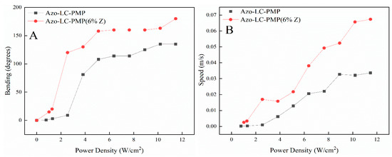 Afterward, the bending properties of Azo-LC-PMPs (manufactured at 50 °C) were studied to understand if the nanoparticles would affect their light response. The polymer films were tested for their bending speed, bending capability and response threshold to light irradiation. The Azo-LC-PMP(6%_Z) performed better than Azo-LC-PMP both in terms of maximum bending angle and bending speed (Figure 10). The power threshold to move the doped sample was again 1 W/cm2. Interestingly, at 1 W/cm2, bending of the composite film was eight times higher than the Azo-LC-PMP film (Figure 10A). At this power density, the speed was nine times higher. The speed difference decreases with an increase in the power density. At the maximum measured power density (12 W/cm2) the doped PMPs had a speed about two times higher (Figure 10B).