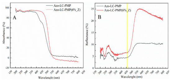 Comparison between the spectra of (A) absorbance, and (B) reflectance of both Azo-LC-PMP and doped Azo-LC-PMP Z.