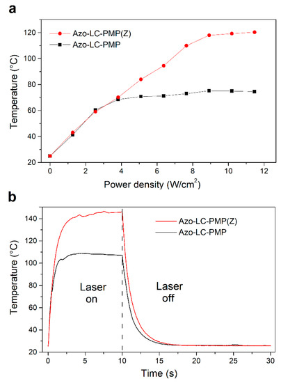 Interestingly, comparing the temperature trend (Figure 12) of Azo-LC-PMP(Z) with its speed (Figure 10B), the two quantities seem to be correlated. This shows that heat plays an important role in improving the performance of the doped PMP.