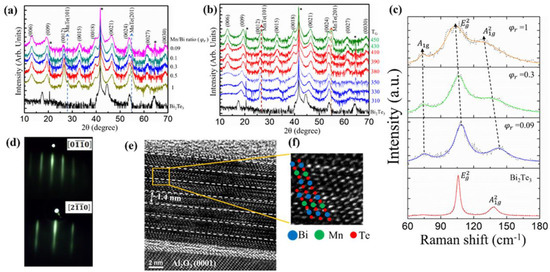 To understand the structural evolution of a MnBi2Te4 film as a function of the Mn/Bi flux ratio () and the growth temperature (TG), we performed X-ray diffraction (XRD) studies on samples in two series. Figure 1a shows the θ–2θ scans for which was tuned from 0.09 to 1; TG was fixed at 410 °C. All MnBi2Te4 films were c-axis (0001)-oriented, which was confirmed with a series of signals that closely match the (003n) signals of bulk MnBi2Te4 [15,42]. Additional signals were observed at about 2θ = 27° and 55°, which are consistent with the formation of a MnTe phase [34]. The intensity of the MnTe phase gradually weakened as decreased from 1 to 0.1. When decreased to 0.09, the MnTe phase disappeared, leaving only the MnBi2Te4 phase. It should be noted that with further decreasing, the XRD spectrum shows diffraction patterns similar to those of Bi2Te3, except that the diffraction peaks are broader than those of Bi2Te3. This suggests that at a lower Mn/Bi ratio, Mn atoms mainly act as dopants without significantly changing the crystalline structure of Bi2Te3. The trends are consistent with the previous reports [33]. Moreover, compared with the previous study [34], the quartz crystal microbalance (QCM) was used to calibrate the, which is different from the calibration by BFM in our study. The calibration with the QCM is to measure the frequency response of solid material deposited on the QCM. This is often linearly related to the ratio of solid materials deposited on the substrate. The calibration method we used is to measure the partial pressure of the molecular beam (Mn, Bi, Te) in the gas phase, and this partial pressure ratio is often not so linear with the ratio of the solid materials deposited on the substrate. This is because the reaction (e.g., sorption and desorption) of gas-phase materials on the substrate can be quite complicated. Therefore, the difference in between our work and the previous result is likely due to the different calibration methods adopted in the two systems. Figure 1b shows the XRD results for which TG varied from 310 to 440 °C; the flux ratio was fixed at = 0.09. For films grown at temperatures 310~340 °C, the intensities of the resolved signals were too weak, but these signals were well distinguished from those of Bi2Te3. With TG increased to 380~410 °C, these signals became well resolved; the intensities increased, which clearly showed the (003n) signals of MnBi2Te4 [15,34,36,42] with no impurity phase. However, when TG increased to 440 °C, volatile Bi-Te was desorbed and additional MnTe signals emerged because of the higher growth temperature. The RHEED in situ showed clear strip patterns, indicating a high crystalline quality and a flat surface of the MnBi2Te4 films, as shown in Figure 1d. Raman spectra were used to investigate how the change of affected the lattice vibration and the electron–phonon interaction in the MnBi2Te4 films, as shown in Figure 1c. The characteristic phonon modes , and were identified in the region of a small wavenumber. The Raman spectra of MnBi2Te4 film have an appreciable blue shift relative to Bi2Te3, which is attributed to the stronger in-plane bond of Mn-Te [42]. As increased from 0.09 to 1, Raman spectra were observed to be red-shifted in these films. The decreasing wavenumber of the vibrational modes ( and ) is associated with an increase in Mn atoms until the formation of Mn interstitial clusters that might be located in the vdW gaps and connected to the Te atoms of the SL [43]. The optimal growth parameters of the MnBi2Te4 films occurred at approximately = 0.09 and TG = 410 °C. For a thin film prepared under the optimized conditions, the HRTEM was applied to examine the film quality. Figure 1e shows the HRTEM image along the c-axis direction, clearly showing the characteristic septuple-layer (SL) structure of the vdW stacking in a MnBi2Te4 epitaxial film. The film thickness was identified as 7 SL. The atomic structure of each SL is visible in the enlarged image (Figure 1f). As the atomic number of Bi is much greater than that of Te and Mn, the Bi atomic column looks brightest, which is also shown in the inset with the superimposed structural model (see the illustration in Figure 1e). The stoichiometry of the film was estimated using the TEM-EDS as shown in Figure S1 and Table S1 (see Supplementary Materials), which showed that Mn:Bi:Te was 1:2.17:3.99, which is consistent with the chemical formula of compound MnBi2Te4. These results indicate that, for the epitaxial growth of stoichiometric crystalline MnBi2Te4 films, the growth temperature and the Mn/Bi flux ratio have narrow windows.