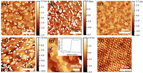 The surface morphology depended strongly on and TG. Figure 2a shows the surface of a Bi2Te3 film as grown, indicating flat terraces. The surface was composed of characteristic triangular terraces and steps, reflecting the growth of the hexagonal crystal Bi2Te3 along (0001) [44,45]. The individual terraces were preferentially aligned with each other; an occasional rotation of 60° was observed, possibly due to the formation of twin boundaries [44]. For= 0.09 and TG = 310 °C, the film surface showed misoriented domains with ambiguous shapes and bright islands, which indicated poor crystalline quality (Figure 2b). The root mean square (rms) roughness was about 6.54 nm. Because TG was too low, adatoms had insufficient energy to diffuse and to move to sites of least potential energy; they then formed a polycrystalline film. As TG increased to 410 °C at = 0.09, the most noticeable feature was the large and flat undefined morphology, as shown in Figure 2c. A significant reduction in 3D bright structures was observed over a large-scale area; its rms roughness was 0.82 nm, which is much less than that of Figure 2b. The layering step is distinguishable on the enlarged surface shown in Figure 2e. The step height is ~1.4 nm (inset of Figure 2e), which is the same as the height of a single SL of MnBi2Te4 [25,46]. For = 0.5 and TG = 410 °C, the surface showed randomly oriented elongated structures, which might be due to the formation of a Mn-rich phase; its rms roughness was 3.85 nm. The STM result revealed that the hexagonal atomic structure on the surface is consistent with the imaging of the topmost Te layer [46,47]; the in-plane lattice parameter was 4.0 Å, as shown in Figure 2f. These structural features confirmed by the AFM and XRD reveal the high quality of the pure MnBi2Te4 films grown by the delicate MBE method.