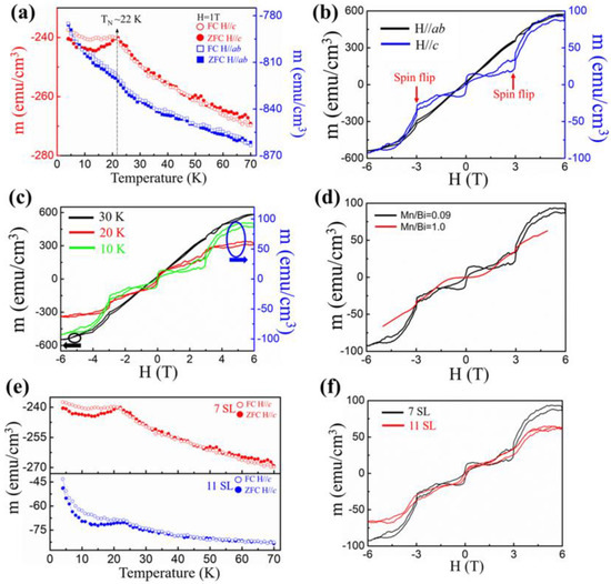In the 2D limit, the odd SL of MnBi2Te4 exhibit QAH insulators and Chern insulators [14,22,48]. The 7 SL and 11SL MnBi2Te4 were used to measure the magnetic properties; these properties of a MnBi2Te4 film were inspected with a SQUID measurement. Figure 3a displays the field-cooled (FC) and zero-field-cooled (ZFC) curves of the 7 SL MnBi2Te4 film when the magnetic field (~1 T) was along the c-axis (H//c) and in-plane ab (H//ab), respectively. The overlapping FC and ZFC curves and λ-shaped feature with an inflection point indicated an A-type antiferromagnetic coupling along the c-axis. The Néel temperature (TN) of the sample was about 22 K, consistent with previous work [15,17,42]. The FC and ZFC curves deviated from each other when the temperature was less than TN, which implies the emergence of a net ferromagnetic moment. When the field was applied along plane ab (H//ab), the magnetic moment decreased to one-third, indicating that the MnBi2Te4 film had strong magnetic anisotropy. Figure 3b shows the field dependence in plane (H//ab) and out of plane (H//c) of magnetization curves of a 7 SL MnBi2Te4 sample. The M–H loop out of plane exhibits a non-linear ferromagnetic shape, whereas the M–H loop in plane is much flatter, indicating a perpendicular magnetic anisotropy with the easy magnetization axis along the c-axis [42,49]. For H//c, the M–H curve exhibits an anomalous magnetic hysteresis loop centered at the regime of a small magnetic field, indicating the spin-flip of individual layers and a ferromagnetic feature, which differs from the antiferromagnetic characteristics of MnBi2Te4 bulk and flakes [42,49,50]. In bulk and exfoliated flakes of MnBi2Te4, the M–H curves are nominally flat in the regime of a small magnetic field. The residual ferromagnetic response might originate from a possible substrate-induced effect, asymmetric upper and lower surfaces, or uncompensated layers [17,48]. Under magnetic field 3 T, the spin-flip transition occurred as indicated by red arrows in Figure 3b. Similar large-field magnetic behavior was observed in MnBi2Te4 flakes [42,48,49,50]. Figure 3c shows the field dependence out of plane of the magnetization curve of a 7 SL MnBi2Te4 sample in the temperature range from 10 K to 30 K. The anomalous magnetic hysteresis loop dwindled with increasing temperature and disappeared at 30 K, which indicates that a magnetic phase transition from an antiferromagnetic state to a paramagnetic state occurred with increasing temperature, consistent with the observation of M-T curves in Figure 3a. Figure 3d shows the field dependence out of plane of the magnetization curves of a 7 SL MnBi2Te4 sample for varied . Compared with the sample with = 0.09, for the sample with = 1, the magnetic hysteresis loop out of plane vanished because of the in-plane magnetic anisotropy of the MnTe phase [51]. To study the thickness-dependent magnetism, the magnetic properties of MnBi2Te4 with 7 SL and 11 SL thickness were observed. Figure 3e shows the ZFC and FC curves of 7 SL and 11 SL MnBi2Te4 films, with the magnetic field (~1 T) along the c-axis (H//c). It should be noted that the Néel temperature (TN) of 11 SL MnBi2Te4 film slightly increases to 23 K compared to that of 7 SL. Figure 3f shows the out-of-plane M–H loop of 7 SL and 11 SL MnBi2Te4. The magnetic hysteresis loop centered at the regime of low magnetic fields is persistent in both samples. However, under high magnetic fields, the spin-flip transition of 11 SL is not obvious, which may be due to the tilt or disorder of the antiferromagnetic configuration as the thickness increases.