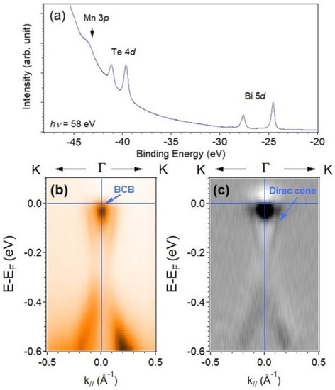 (a) The XPS spectrum of MnBi2Te4 with photon energy 58 eV. (b) The band-mapping result of a MnBi2Te4 sample measured at 80 K along direction Γ-K with photon energy 24 eV. (c) The second derivative of (b) to enhance the visibility of a Dirac cone.
