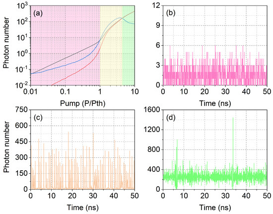 Figure 2b–d shows examples of computed temporal laser output for three different pump values: below threshold (, panel (b)), in the low-coherence region (, panel (c)) and for (predominantly) coherent emission (, panel (d)). A fluctuating photon number characterizes the below-threshold signal (Figure 2b) mostly constituted by spontaneously emitted photons. Twice above , the output consists of large photon bursts separated by a very low (spontaneous) background: here the peak photon number is more than one order of magnitude larger than its average (Figure 2c). This is the ASE-like regime where low phase coherence arises from the independence of the pulses since each of them grows out of noise; thus, devoid of a correlation with previous ones. Figure 2d shows the shape of the signal emitted when the pump is six times above : a noisy, continuous output is interrupted by strong fluctuations in the shape of bursts or groups of bursts, whose amplitude can be more than four times the average. However, the (nearly) uninterrupted stream of photons generated by the laser through stimulated emission is an indication of a degree of coherence presumably too large for illumination, even though the substantial amount of photon noise belies what is normally considered good lasing.