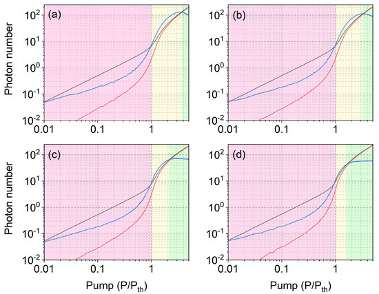 Figure 2a shows the average total photon output (where , black curve, with and stimulated and spontaneous output photons, respectively) and the average stimulated emission (red curve) calculated from the temporal data sequences in a time window s, shown in logarithmic scale. We are here profiting from the benefit of the stochastic numerical simulation, which allows us to separately observe the spontaneous and stimulated processes to gain insight into the natural constituents of the output—incoherent and coherent photons—a kind of information that is not directly observable in experiments (and typically not even in most traditional laser models). This first piece of information permits quantification of the percentage of the illuminating photons, which are potentially coherent with each other.