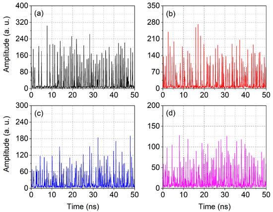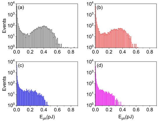 Finally, the autocorrelation function (cf. Figure S3) confirms that superthermal statistics are found for the conditions of Figure 4a–c and that for those of Figure 4d (thus above the experimentally observed limit, , for photon bursts—Section 4). This finding supports the statement of independent pulses, thus enabling the inference of low field coherence.