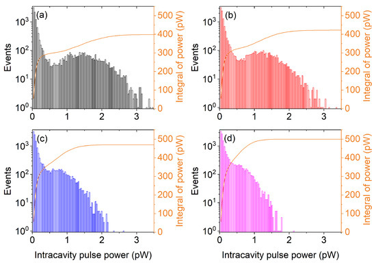 Histograms of pulse power distribution for feedback fractions : (a); (b); (c); and (d), respectively. Pump: ; (b); (c); and (d).