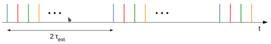 In order to delve a bit deeper into the understanding of the picture, we identify the intracavity photon bursts that coincide with the coupling of an external photon into the cavity. We are starting from the assumption, illustrated by Figure 5, that injected photons that intervene after the generation of the intracavity pulse will not introduce a robust phase relationship. This is quite reasonable, especially observing that the number of reinjected photons is typically at least three orders of magnitude smaller than the number of intracavity stimulated photons: an external signal will stand a chance of introducing phase coherence only if it is the initiator of the pulse. One should also keep in mind the fact that pulses, as mentioned in the introduction for ASE, possess a moderate amount of coherence (typical bandwidths can be a couple of nanometers); thus, one should not expect a strong coherence to emerge.