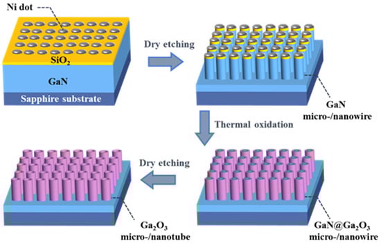 Figure 1 schematically depicts the preparation steps of β-Ga2O3 micro-/nanotubes in this study. GaN micro-/nanowire arrays were placed in a quartz tube for thermal oxidation to form GaN@Ga2O3 micro-/nanowire arrays [24,27]. During the oxidation process, the pure oxygen flow was maintained at 200 sccm, and the oxidation temperature was fixed at 850 °C, 900 °C and 950 °C. Then the vertical β-Ga2O3 micro-/nanotube arrays were fabricated by selective etching of the GaN@Ga2O3 micro-/nanowire arrays using the ICP etching technique. Before etching, the prepared GaN@Ga2O3 micro-/nanowire arrays were immersed in a buffer oxide etching (BOE) solution to remove the remaining Ni/SiO2 mask layer. GaN@Ga2O3 micro-/nanowire arrays were etched using ICP etching conditions for GaN to prepare β-Ga2O3 micro-/nanotube arrays. The Cl2/BCl3 (48/6 sccm) was used as the etching gas, RF/ICP power was fixed at 100/300 W, and the chamber pressure was kept at 10 mTorr for 5 min of etching time.