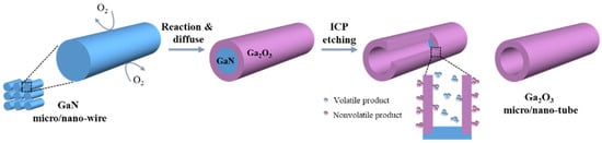 Schematic illustration of the formation process of β-Ga2O3 micro-/nanotube depicted as a selective etching between GaN and β-Ga2O3.