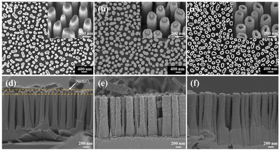 Figure 3a,d shows the SEM images of vertical GaN NW arrays on the sapphire substrate. The density of the GaN NWs is about 8.7 × 108 cm−2, and the average height and diameter are 1.6 μm and 200 nm, respectively. From Figure 3d, it can be observed that the remaining Ni/SiO2 mask layer is on the top of the GaN NWs with relatively vertical sidewall profiles. Compared with other soft masks, this mask has better anisotropic etching characteristics for GaN materials. Besides, to a certain degree, the mask layer can prevent the reaction and diffusion of O2 from the top of the NW in the subsequent thermal oxidation process.