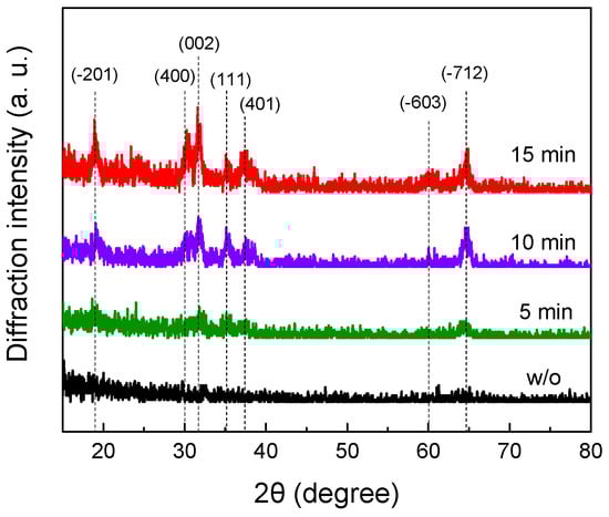 The grazing incidence in-plane geometry was used to determine the crystal structure of Ga2O3 grains. Figure 4 shows the in-plane diffraction patterns of unoxidized GaN nanowires and Ga2O3 nanotubes oxidized at 950 °C for 5 min, 10 min, and 15 min. The XRD reflections at 18.9°, 30.2°, 31.7°, 35.1°, 37.4°, 60.0°, and 64.7° were assigned to the beta phase of monoclinic Ga2O3 planes (−201), (400), (002), (111), (401), (−603) and (−712), respectively. The result indicates that GaN is converted to polycrystalline β-Ga2O3 after thermal oxidation treatment.