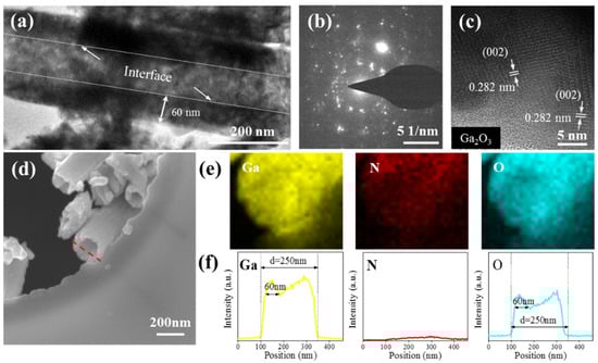 Figure 5a shows the TEM image of β-Ga2O3 NT oxidized at 950 °C for 10 min. As expected, the cavities of the NT can be clearly seen. It can also identify a clear interface on the inner wall of the tube. The outer diameter and wall thickness of the NT is about 200 and 60 nm, respectively. The selected area electron diffraction (SAED) image is shown in Figure 5b, and the diffraction pattern indicates that the β-Ga2O3 NT is polycrystalline. From the HRTEM image in Figure 5c, the lattice spacing of approximately 0.282 nm corresponds to (002) plane of β-Ga2O3 [36]. In addition, the EDS element mapping and the line-scan images of individual NT were also performed. The yellow, red, and blue images of the EDS mapping analysis in Figure 5e illustrate the presence of Ga, N, and O elements, respectively. It can be seen that Ga and O elements are mainly distributed on the NT, while the distribution of N elements has no obvious aggregation. Figure 5f shows the EDS line-scan analysis of the marked red line area in Figure 5d. It can be seen that the peak profile of Ga and O elements is valley-shaped, the intensity on both sides is higher than the intensity at the center, and the thickness of the tube wall is about 60 nm. The content of N element is very low. These results are consistent with the TEM image and prove a hollow tubular structure.