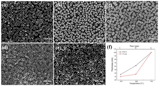 SEM images of the β-Ga2O3 NT arrays prepared in different oxidation times at 950 °C for (a) 5 min, (b) 10 min, (c) 15 min. SEM images of the β-Ga2O3 NT arrays prepared in different oxidation temperatures for 15 min at (d) 850 °C and (e) 900 °C. The oxidation rate images (f) of β-Ga2O3 NTs under different oxidation conditions.