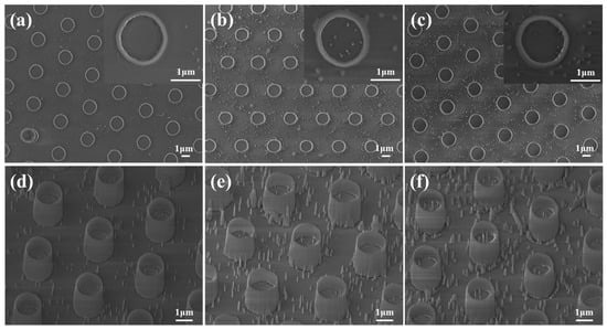 The GaN NWs etched by self-assembled Ni metal mask technology are usually unevenly distributed [40], resulting in uneven distribution of subsequent NTs. Therefore, the GaN templates were patterned by photolithography, and then periodic MT arrays with an outer diameter of about 1.7 μm were prepared using the same route. The β-Ga2O3 MT arrays prepared by oxidation for 20 min, 30 min, and 40 min in an environment at a temperature of 950 °C are shown in Figure 7. The MTs also have a hollow structure with a density of about 7 × 106 cm−2. As the oxidation time increases, the corresponding wall thicknesses are about 130 nm, 150 nm, and 155 nm, respectively (Figure 7a–c). In addition, more needle-like nanostructures appeared on the GaN surface (Figure 7d–f). GaN needle-like nanostructures tend to be formed at the defects of the GaN template. The reason is that the GaOx products migrate on the surface and accumulate to form large grains at the surface defects during the thermal oxidation [25], which serves as a mask to form needle-like nanostructures on the GaN surface during the etching process.