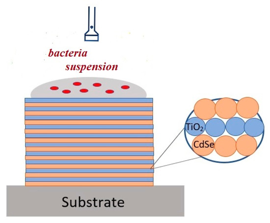 We formed our multilayered hybrid structures using the modified Langmuir–Blodgett technique [43]. Briefly, colloidal solutions of titania nanoparticles and CdSe QDs in toluene were dropped onto the water surface, and titania NP or CdSe QD layers were formed on the water–air interface due to toluene evaporation; then, the layers were transferred to the dielectric substrates (See Section S2 and Figure S2 of the Supplementary Materials for details). Hybrid structures containing ten double layers, each of which comprised a monolayer of CdSe QDs and a monolayer of titania NPs, were formed. See the Supplementary Materials for a detailed characterization of the samples (Section S3: Figures S3–S6). This a hybrid structure architecture was optimal to obtain a correct assessment of the antibacterial activity. A pronounced antibacterial effect was observed within a short period of time, during which other factors could not affect the survival of the tested bacteria.
