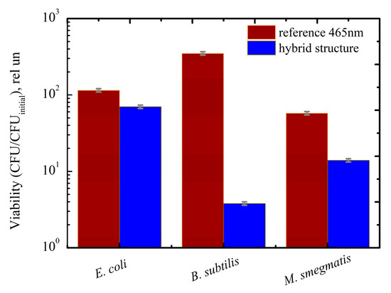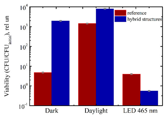 The viability of the bacteria when the titania NP/CdSe QD hybrid structures were under the 465 nm irradiation is presented in Figure 4 in comparison with the reference (see Section 2 for details).