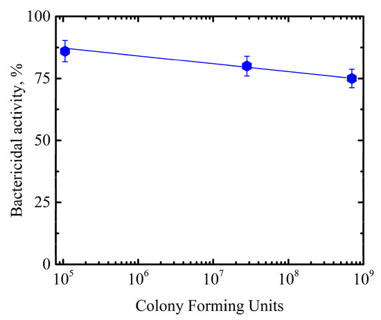 We also found that the bactericidal activity of our hybrid structures only weakly depends on the number of colony-forming units in the titer of the initial M. smegmatis mc2 155 bacteria suspension, as seen in Figure 6, where the activity is well expressed within a wide range of the initial titer.