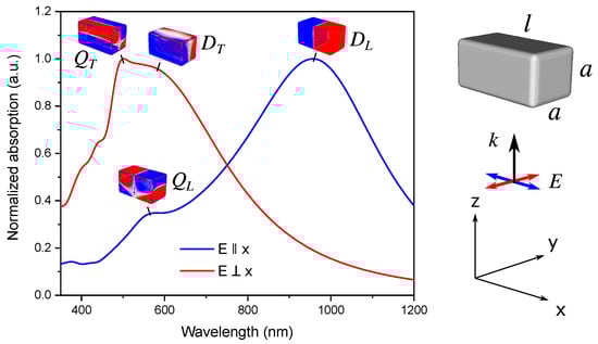 Normalized extinction of Ag nanobar with l = 180 nm and a = 100 nm upon illumination with light polarized parallel (blue) and perpendicular (red) to the long axis of the particle. The charge distribution plots show the corresponding LSPR modes at particular wavelengths: D and Q stand for the dipole and quadrupole modes; indices L and T denote the longitudinal and transverse polarization; also shown are the dimensions of the particle, the light propagation direction, and polarization.