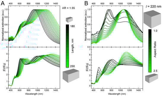 Spectral tunability of Ag nanobar’s LSPR modes. Normalized extinction spectra (top) and electric field enhancement (bottom) for the Ag nanobar of various lengths and the constant aspect ratio of 1.55 (A) and various aspect ratios at the constant particle length of 220 nm (B).