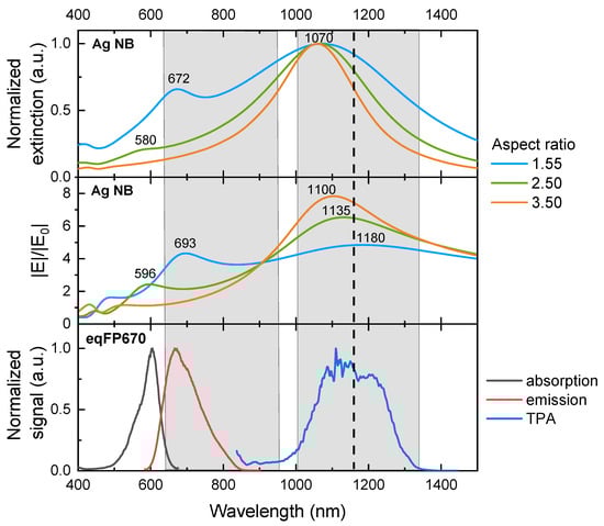 Spectral properties of the system under study. Top and middle: normalized extinction and electric field enhancement near Ag NB with nm and various aspect ratios. Bottom: normalized absorption (black), emission (red) and two-photon absorption (blue) spectra of eqFP670 [5]. The dashed line marks the irradiation wavelength. The grey regions demonstrate the two biological transparency windows.