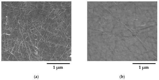 FE-SEM images of the thin-film electrodes are shown in Figure 1. The average diameters of the SWCNT bundles, which are clearly observed in the images of FTitania and FCOMP, were 14 ± 3 and 12 ± 3 nm, respectively. The surface roughness values of FTitania and FCOMP were 1.6 and 1.9 nm, respectively, as determined by the AFM 3D surface appearances (Figure S1). The maximum height difference between the highest and deepest positions deviated from the average surface of FTitania and FCOMP is 20 and 27 nm, respectively. The film thickness and sheet resistance of FTitania were 110 ± 10 nm and 0.21 ± 0.01 MΩ/sq, respectively, and those of FCOMP were 100 ± 10 nm and 0.44 ± 0.01 MΩ/sq, respectively. The electrical resistivity of FCOMP could thus be estimated as (6.6 ± 0.7) × 10−2 Ω cm. The pencil hardness of both electrodes was 4H.
