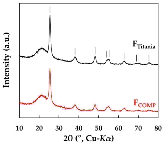 The XRD patterns of FTitania and FCOMP are shown in Figure 2. Nine peaks at 2θ = 25.5, 38.1, 48.3, 54.2, 55.4, 62.7, 69.3, 70.6, and 75.6° are assignable to the (101), (004), (200), (105), (211), (204), (116), (220), and (215) phases of anatase [ICDD 01-070-6826], respectively, in both patterns.