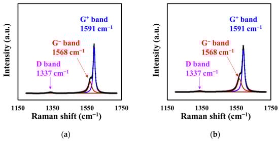 The Raman peaks of FTitania and FCOMP in the range of 1200–1720 cm−1 were successfully deconvoluted into three characteristic peaks attributable to the phononic mode of the SWCNTs (Figure 3). In both electrodes, the heat-treatment temperature to which the SWCNTs were exposed and the contact opportunity between the SWCNTs and anatase crystals significantly depended on whether the SWCNTs were above or inside the anatase layer (Scheme 1). However, the Raman spectra of both electrodes showed no significant difference in the peak positions, indicating same-level interaction between the SWCNTs and anatase.