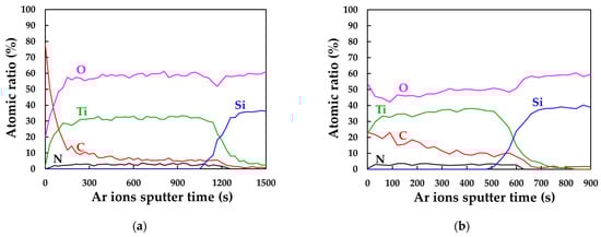 The C/Ti ratio of the thin-film electrodes was also calculated by replacing O 1s with C 1s in an identical manner. To determine the C/Ti ratios in the deeper portions of the thin-film electrodes, XPS depth profiling was performed using Ar+ ion sputtering at an acceleration voltage of 400 V and a current density of 8.9 mA cm−2 at 30 s intervals. The atomic ratios of C, N, O, Si, and Ti in the thin-film electrodes were calculated from the relative sensitivity factors and the peak areas of C 1s, N 1s, O 1s, Si 2p, and Ti 2p3/2, respectively.