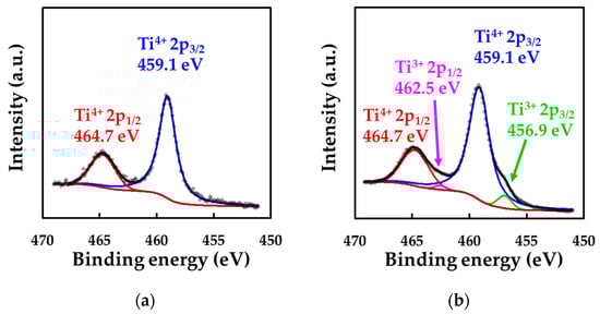 Figure 5 shows the XPS spectra of FTitania and FCOMP in the range of 451–469 eV after Ar+ ion sputtering at an acceleration voltage of 150 V for 15 s, along with the deconvoluted peaks. The peaks at 459.1 and 464.7 eV for both electrodes correspond to Ti 2p3/2 and Ti 2p1/2, respectively, of Ti4+. In the case of FCOMP, the deconvoluted peaks at 456.9 and 462.5 correspond to Ti 2p3/2 and Ti 2p1/2, respectively, of Ti3+ [,].