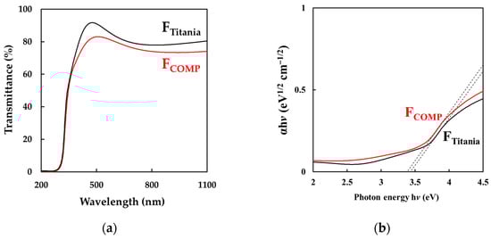 (a) Transmittance spectra and (b) Tauc plots of FTitania and FCOMP.