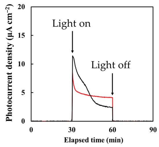 FTitania and FCOMP were used as working electrodes. For both cases, a platinum plate (20 × 20 mm2) and double-junction Ag/AgCl were used as the counter and reference electrodes, respectively. A light-emitting diode (LED, model: CL-1503, LED head: CL-H1-365-9-1, Asahi Spectra Co., Ltd., Tokyo, Japan) was used as the UV light source with an intensity of 16 mW cm−2 at a wavelength of 365 nm. All measurements were performed in a 0.1 mol L−1 Na2SO4 solution after bubbling Ar gas at 50 mL min−1 for 10 min. The photocurrent densities were measured at 10 s intervals, first in the dark condition for 30 min, followed by irradiation with UV light for 30 min, and then again in the dark. The photocurrent density was recorded using a VersaSTAT 4 galvanostat/potentiostat (Princeton Applied Research Corp., Oak Ridge, TN, USA) under natural potential. The photocurrent densities of the three samples of each electrode were measured independently. The steady-state photocurrent densities (SSPD) of FCOMP and FTitania, which reached a steady state after 30 min of UV irradiation, were obtained.
