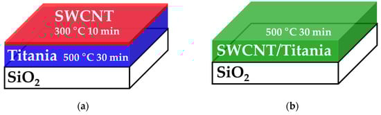 A titania precursor solution (STitania) was prepared by diluting 9.0 g of the molecular precursor solution (TFLEAD-Ti) with 1.0 g of ethanol. The solution was stirred using a magnetic stirrer for 1 h at room temperature. The concentration of Ti4+ ions was 0.45 mmol g−1. The SWCNT-dispersed solution (SCNT) was prepared by diluting 1.0 g of eDIPS INK with 3.0 g of ethanol, followed by stirring with a magnetic stirrer for 1 h at room temperature. The SWCNT/titania precursor solution (SCOMP) was prepared by mixing 10.0 g of TFLEAD-Ti and 6.0 g of eDIPS INK. The mixed solution was stirred using a magnetic stirrer for 1 h at room temperature. The concentration of Ti4+ ion in SCOMP was 0.31 mmol g−1 and that of SWCNT was 0.075 mass%.