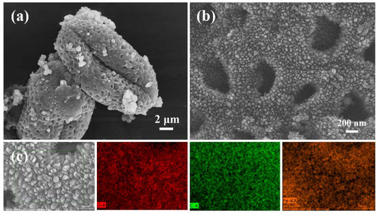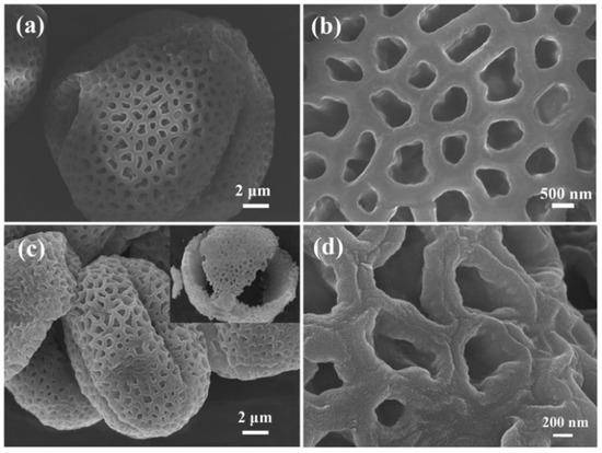 In recent years, electrode materials with novel structures have been designed by using natural organic biomass such as microalgae [24], lychee exocarp [25], corncob [26], and peanut shells [8] as carbon sources. Rape pollen (RP) grains have aroused great interest for their characteristic 3D porous architecture [27,28]. The structure of this hollow sphere can optimize the volumetric expansion of electrode material and also bridge the diffusion path of Li-ions owing to the abundant cavities inside the hollow sphere.