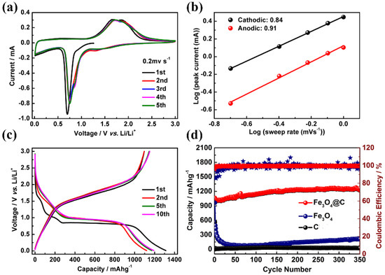 To characterize the electrochemical behavior of the Fe3O4@C electrode, various electrochemical measurements were performed. Figure 5a displays the first five CV curves for Fe3O4@C anode at 0.2 mV s−1. One obvious sharp peak in the first cycle observed at ~0.71 V during the cathodic process is caused by the transformation of Fe3+/Fe2+ to Fe (0) and the occurrence of solid electrolyte interphases (SEI) [34]. As for the next four cycles, the peaks shift to a higher voltage of 0.76 V and almost remain consistent, suggesting the stability of the SEI films without any other side reactions except for the conversion of Fe3+/Fe2+ into Fe (0). Moreover, the intensity of the reduction current in the first cycle is stronger, which further demonstrates the occurrence of irreversible reactions. Both anodic peaks at about 1.65 and 1.85 V can be originated from the oxidation of the iron metal to Fe3O4. To reveal the kinetics behavior of the Fe3O4@C electrode, Figure S4 presents the CV curves at various scanning rates. As a rule, the relationship between the peak current (i) and scanning rate (v) follows the power law [35].