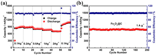 (a) Rate capability and CE of Fe3O4@C electrode at 0.1 to 2 A g−1; (b) cycling stability and CE of Fe3O4@C at 1 A g−1 for 200 cycles.