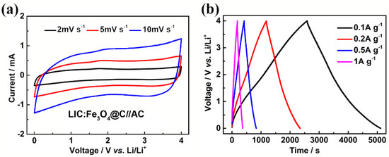(a) CV curves of Fe3O4@C//AC LIC at 2–10 mV s−1, (b) GCD profiles of Fe3O4@C//AC LIC at 0.1–1 A g−1.