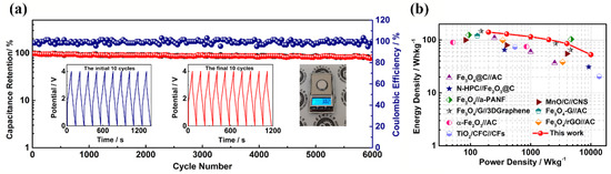 (a) Long-term cycling performance and CE of Fe3O4@C//AC LIC at 2 A g−1. Inset: GCD profiles of the initial 10 cycles (blue) and the final 10 cycles (red) and the optical photograph showing the microscale worked by our LIC device; (b) Ragone plots of LIC in our work and other previously reported LICs.