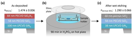 Process transfer of the porSiO2 synthesis from bulk substrates to free-standing membranes. (a) In the first step, a LPCVD SiNy membrane supported by a Si substrate was covered with SiO2 and subsequently with SiOxNy by PECVD. (b) In the second step, the sample was placed on a tailor-made PTFE sample holder in aqueous H3PO4 on a hot plate, which was set to 150 °C, to selectively remove the SiNy compounds from the SiOxNy. A glass plate was loosely assembled on the beaker to avoid concentration changes in the etchant by water evaporation. (c) The effective RI of the porSiO2 was repeatedly reduced to 1.290 by etching of the sample for 90 min. Simultaneously, ultra-thin membranes were generated by thickness reduction of the lowest LPCVD SiNy layer in the H3PO4. The etchant had access to the membrane’s backside through the hole in the sample holder, which allowed for the SiNy thickness reduction with a rate of (0.65 ± 0.04) nm/min.