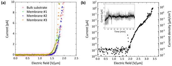 The FE properties of the ZnO NWs that were grown on porSiO2 generated with the gentler second etching method—using heated instead of boiling H3PO4 (Figure 2)—were investigated in two in-house built FE setups. To examine the reproducibility of the FE performance, the onset field was defined by the emission current overcoming a 10 σ threshold from the data mean with the standard deviation (σ) derived from the normal distribution of the measured current values. The onset fields of three ZnO NW-membrane samples grown on porSiO2 with an RI of about 1.29 varied only 10% around the mean of 1.6 V/µm (Figure 5a, filled symbols). For comparison, a ZnO NW array grown on a bulk substrate showed the same onset field (Figure 5a, empty circles). Note, Membrane #1 (plotted in green) was measured in the first FE setup (2 × 10−4 Pa) and the other samples were measured in the second FE setup (1 × 10−5 Pa). As displayed in Figure 5b, currents above 1 µA were obtained, but electrical discharge prevented further emission current rise. The turn-on field defined by an emission current density of 0.1 µA/cm2 was reached at an electric field of 3.0 V/µm (Figure 5b, right axis). Note, the emission current density was determined by division through the total macroscopic area that was exposed from the emitter array (0.16 cm2) []. Additionally, the stability of the emission current over time was tested as presented in the inset of Figure 5b since it is a critical property for the use as an FE-based sensor. The applied field was held constant at 3.4 V/µm, while the current was measured two times for 94 min each. An emission current of about 1.6 µA could be measured at the beginning, which increased to about (2.8 ± 0.3) µA within the first 10 min.
