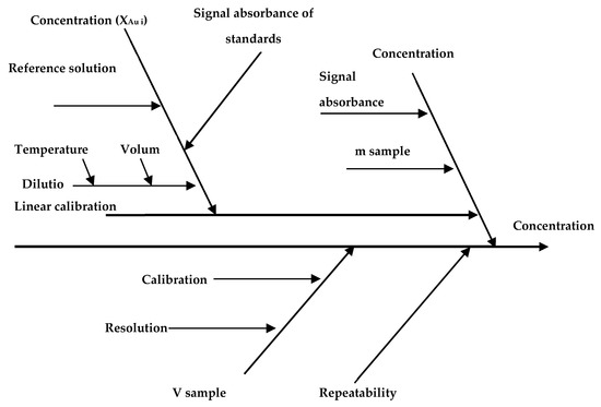 where XAu is the final concentration of AuNPs in biological tissue sample, XAui is the Au concentration measured by GFAAS, m sample is the sample biological tissue mass and rep is a repeatability factor included into the model to take random uncertainty components (type A) into consideration [34,35]. Considering the measurement model components, each source of uncertainty was identified, according to the Ishikawa diagram presented in Figure 2.