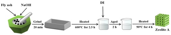 The fly ash was provided by a thermal power plant (Inner Mongolia Thermal Power Plant, Inner Mongolia, China) in China. Fly ash which used in the experiment is mainly composed of 46.36 wt.% SiO2 and 45.08 wt.% Al2O3. Moreover, the Si/Al molar ratio is around 1.0, there are no extra Si- or Al-sources needed. The main crystalline component of fly ash is mullite, as shown in Figure A2a. The silicon and aluminum sources in fly ash are in an inactive state. The crucial step for activation treatment of fly ash is calcining mixtures which are consists of fly ash and sodium hydroxide at 600 °C for 2.5 h. XRD pattern of activated fly ash is shown in Figure A2b. The SEM images of fly ash and activated fly ash are shown in Figure A3. The chemical reagents (NaOH) used were analytically pure and purchased from Sinopharm Chemical Reagent Co., Ltd. (Shanghai, China). Commercial-grade zeolite 4A was purchased from Sinopharm Chemical Reagent Co., Ltd. XRD pattern of the commercial-grade zeolite 4A is shown in Figure A1. Deionized water was prepared in the laboratory.