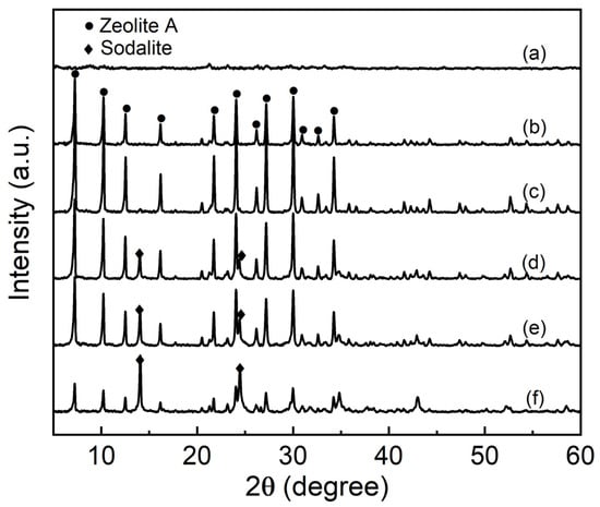 The SEM images of samples synthesized at different NaOH concentrations are shown in Figure 5. When the alkali concentration is 0.25 mol·L−1, the sample shows the appearance of amorphous aluminosilicate, indicating that zeolite A has not started to crystallize. Under this alkali concentration, the hydroxide ion concentration is too low, the dissolution rate of amorphous aluminosilicate is slow, and the concentration of active aluminate, silicate and aluminosilicate is low, which is not conducive to the formation of crystal nuclei. In addition, the low concentration of cations (Na+) inhibits the formation of the zeolite A framework structure. As the alkali concentration increases, zeolite A begins to crystallize. When the alkali concentration is 0.5 mol·L−1, the cubic zeolite A appears on the surface of the amorphous aluminosilicate structure. When the alkali concentration is 1.0 mol·L−1, the amorphous aluminosilicate structure disappears completely, and the cubic zeolite A has a good microscopic crystal morphology (Figure 5c (inset)). Therefore, it can be concluded that as the alkali concentration increases, the nucleation rate in the synthesis system increases and the polymerization rate between silicate ions and aluminate ions increases. However, as the alkali concentration increases, sodalite will be formed in the synthetic system. An enlarged view of sodalite is shown in Figure 5e (inset). Next, a systematic study of zeolite A synthesized under optimal conditions is carried out.