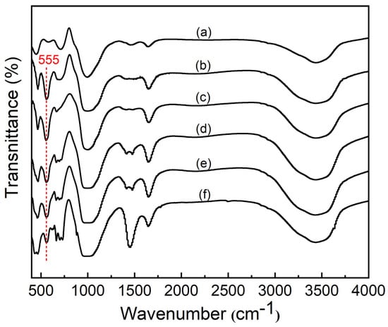 FTIR spectra of samples synthesized at different NaOH concentrations (NaOH concentrations: (a) 0.25 mol·L−1, (b) 0.5 mol·L−1, (c) 1.0 mol·L−1, (d) 1.5 mol·L−1, (e) 2.0 mol·L−1 and (f) 2.5 mol·L−1).