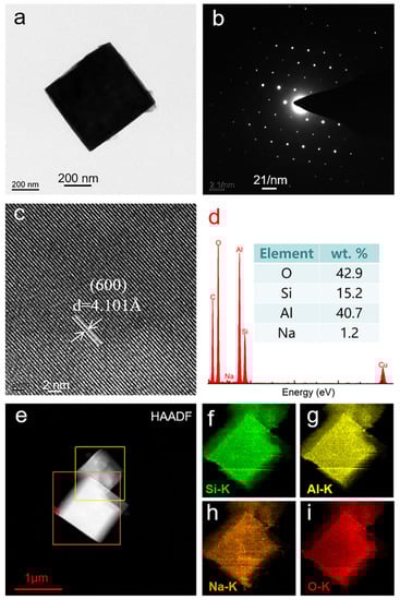 The microstructure of zeolite A was further studied by the TEM technique, as shown in Figure 6. Figure 6a shows that the morphology of zeolite A is consistent with the standard zeolite A in size and structure, indicating that zeolite A has the characteristics of solid growth and opaque morphology. Figure 6b is an electron diffraction pattern, indicating that zeolite A has a body-centered cubic structure. The HRTEM image (Figure 6c) shows clear lattice fringes with a crystal interplanar spacing of about 0.4101 nm, which corresponds to the (600) crystal plane of zeolite A. The EDX analysis results (Figure 6d) show that the main constituent elements are Na, Al, Si and O, indicating that the elements Si, Al, Na and O constitute the framework of zeolite A. According to the element content table, the percentages of Na, Al, Si and O in zeolite A are 1.2%, 40.7%, 15.2% and 42.9%, respectively. The HAADF STEM-EDX element mapping is used to further reveal the distribution of Si, Al, Na and O elements in the zeolite A structure. From Figure 6e–i, it can be more intuitively observed that Si, Al, Na and O elements are distributed in the zeolite A crystal. In addition, it can be seen that the elements coexist and are uniformly distributed. Meanwhile, sodium ions cooperate with silicon-oxygen tetrahedra and aluminum-oxygen tetrahedra to form the framework structure of zeolite A.