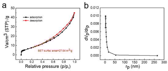 The specific surface area and pore size distribution of zeolite A were studied using N2 adsorption-desorption technology. In the range of relative pressure P/Po = 0.5–1.0, pressure hysteresis is observed (Figure 7a), indicating that the sample contains a mesoporous structure [,,,,]. The Brunauer–Emmett–Teller (BET) surface area of zeolite A obtained by BET method is 27.64 m2·g−1. The Barrett–Joyner–Halenda equation (BJH) method is used to study the pore size distribution of the zeolite A as shown in Figure 7b.