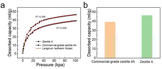 Figure 8a is carbon dioxide adsorption isotherm of commercial-grade zeolite 4A and zeolite A at 298 K. From Figure 8a, as the equilibrium pressure increases, the amount of carbon dioxide adsorbed rapidly increases, indicating that an appropriate equilibrium pressure promotes the activity of most adsorption sites. As the equilibrium pressure continues to increase, the amount of carbon dioxide adsorption tends to stabilize, indicating that all adsorption sites are occupied by carbon dioxide. In addition, the initial slope has a linear relationship with the carbon dioxide concentration, and then it exhibits saturation behavior at high carbon dioxide concentrations. Meanwhile, the determination coefficient values of the Langmuir model of zeolite A and commercial-grade zeolite 4A are 0.998 and 0.999, respectively. Therefore, the experimental data in Figure 8a is in good agreement with the Langmuir model represented by Equation (7). In general, combined with the experimental data, the carbon dioxide adsorption characteristics of zeolite A are in good agreement with the Langmuir adsorption model, which proves the effectiveness of the model to describe the carbon dioxide adsorption characteristics of zeolite A. It is concluded from the above research that this study has guiding significance for determining the adsorption pressure and regeneration pressure in the pressure swing adsorption process. Meanwhile, the adsorption process is a single layer adsorption on an ideal surface []. In addition, when carbon dioxide adsorption reaches an equilibrium state, the maximum adsorption capacity of zeolite A is 46.5 mL·g−1, compared to 39.3 mL·g−1 of the commercial-grade zeolite 4A (Figure 8b). Consequently, zeolite A synthesized with fly ash has certain advantages in carbon dioxide adsorption applications.