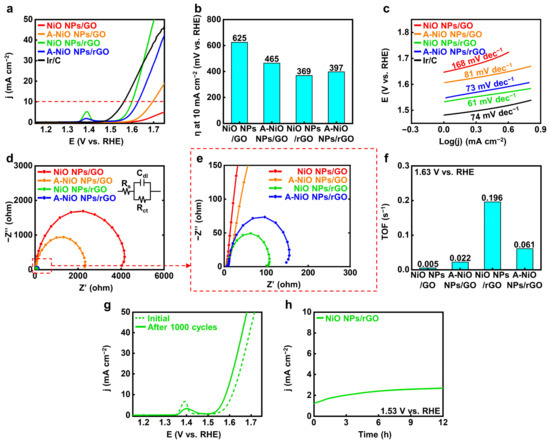 We also evaluated the OER performances of the catalysts compared to commercial Ir/C. Figure 5a shows the LSV curves of the catalysts and Figure 5b represents their corresponding overpotentials at 10 mA cm−2 (red dashed line), respectively. As a reference sample, the commercial Ir/C represents 332 mV as the overpotential. The NiO NPs/rGO exhibits the lowest overpotential as 369 mV compared to those of the A-NiO NPs/rGO as 397 mV, the A-NiO NPs/GO as 465 mV, and the NiO NPs/GO as 625 mV. It shows higher OER activity than previously reported catalysts, ranging from 390 mV to 510 mV vs. RHE (see Table S3). Additionally, small peaks near 1.40 V vs. RHE occur for the NiO NPs/rGO and the A-NiO NPs/rGO. These peaks are originated from the change in NiO to Ni(OH)2 when exposed to the alkaline solution, and Ni(OH)2 is oxidized to NiOOH in the anodic potential [41]. Moreover, it implies that if the area of the peak becomes larger, the surface area of the catalyst will be increased, and thus, it will have a higher number of active sites in OER [42]. In fact, the NiO NPs/rGO shows the largest peak among all the measured catalysts, and it also matches well with the aforementioned results. Furthermore, as shown in Figure 5c, NiO NPs/rGO exhibits the lowest Tafel slope with 61 mV dec−1, which is lower than those of the A-NiO NPs/rGO with 73 mV dec−1, the A-NiO NPs/GO with 81 mV dec−1, the NiO NPs/GO with 168 mV dec−1, and the Ir/C with 74 mV dec−1. It also represents that hydroxyl ions are prone to adsorb on the NiO NPs/rGO surface and trigger oxygen evolution faster than other catalysts, resulting in less overpotential to achieve specific current density. Based on this outcome, we might regard that the NiO NPs/rGO has superior OER performance to all of the synthesized electrocatalysts. In addition, we conducted EIS measurements to compare the charge transfer resistance on the catalyst surface, as shown in Figure 5d,e. We found that the NiO NPs/rGO has the lowest Rct with approximately 100 Ω, and the resistance increases in the cases of the A-NiO NPs/rGO with 150 Ω, the A-NiO NPs/GO with 2300 Ω, and the NiO NPs/GO with 4000 Ω. These results indicate that the NiO NPs/rGO has surpassing charge transfer characteristics on the surface. Accordingly, the NiO NPs/rGO demonstrates the highest oxygen turnover rate, as shown in Figure 5f. The TOF calculation for OER also confirms that the NiO NPs/rGO could convert hydroxyl ions to oxygen molecules rapidly under a given potential of 1.63 V vs. RHE. In addition, we also measured the LSV of the catalysts, which are annealed at different temperatures, and it could be considered that the annealing procedure would not promote OER activity (see Figure S7c,d), and thermal annealing without H2 shows better activity than H2-introduced A-NiO NPs/rGO (see Figure S8c,d). Moreover, mass-normalized activity in OER also corresponds with the geometrically normalized data, as shown in Figure S9b. For further characterization, we analyzed the long-term durability of the OER by CV and CA. As shown in Figure 5g, an LSV curve after 1000 cycles (green solid line) exhibits a decreased peak at 1.40 V vs. RHE, but a slightly higher activity than the initial curve (green dashed line), indicating that its stability was maintained through repeated redox reactions. The CA graph in Figure 5h shows that the NiO NPs/rGO retained its activity over 12 h at 1.53 V vs. RHE, which suggests its high durability performance in an alkaline solution.